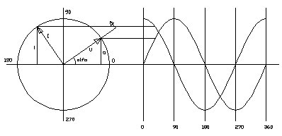 De pijl draait linksom, tegen de klok in. Als we de hoogte van de pijl uitzetten tegen de hoek (= tijd) dan ontstaat de sinus vorm.